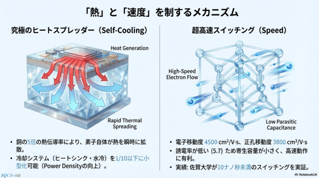 ダイヤモンド半導体の登場は、従来の「冷却系の設計(流体、ファン、ポンプ)」を「材料そのものによる熱制御」へと変貌させます。
