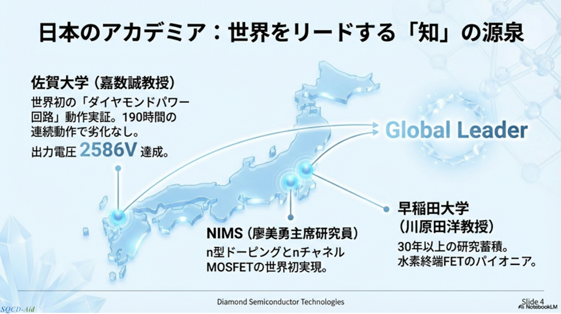 佐賀大学(嘉数教授)の世界最高出力実証、NIMSのnチャネルMOSFET開発、大熊ダイヤモンドデバイスによる量産工場建設など、研究・製造の両面で世界トップクラスの「縦串」を保有しています。