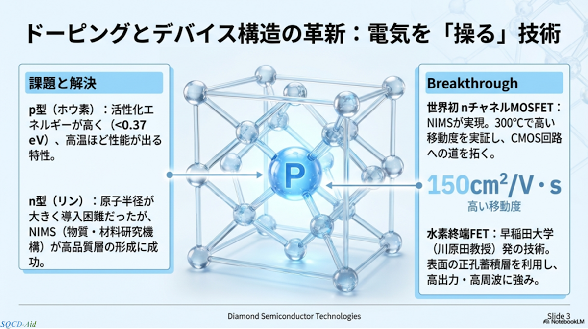 ・ n型: リン(P)のドープ。ボロン以上に難易度が高く、NIMS(物質・材料研究機構)が成功した高度なプロセス技術が不可欠です。