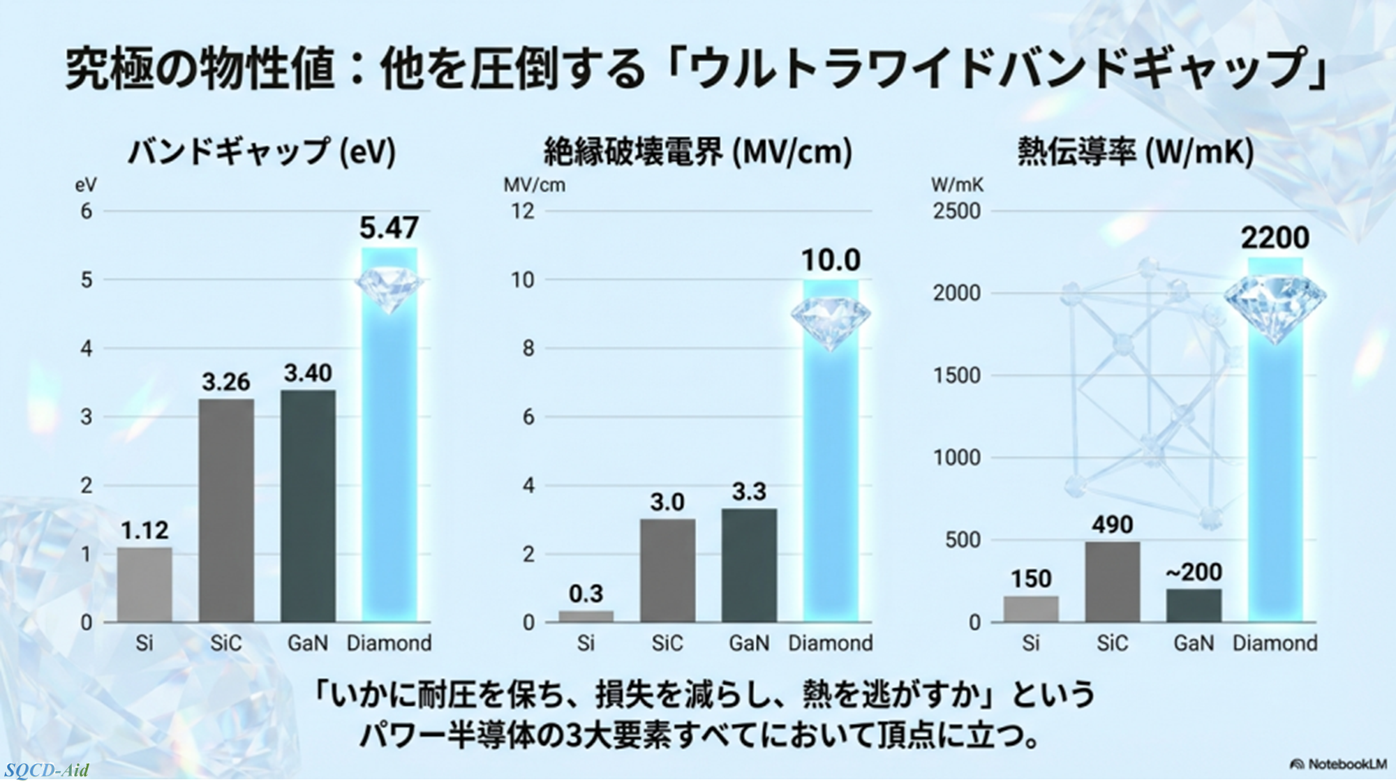 機械系エンジニアにとって、半導体材料の選択は「熱設計」と「絶縁設計」のトレードオフです。ダイヤモンドはこの双方において圧倒的な優位性を持っています。