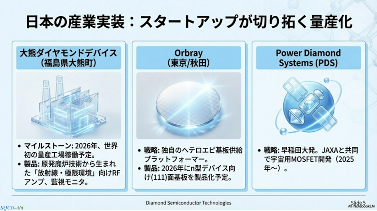 ・ 大熊ダイヤモンドデバイス: 福島県大熊町に世界初の量産工場を建設中で、2026年の稼働を予定。放射線耐性を活かした原発監視用センサーやRFアンプを開発しています。
